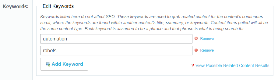 * This new option will come in handy in situations such as merging information from multiple content items into a single one. You would want to only keep the best performing URL and then you could "Unpublish and Redirect" the other items to this URL.