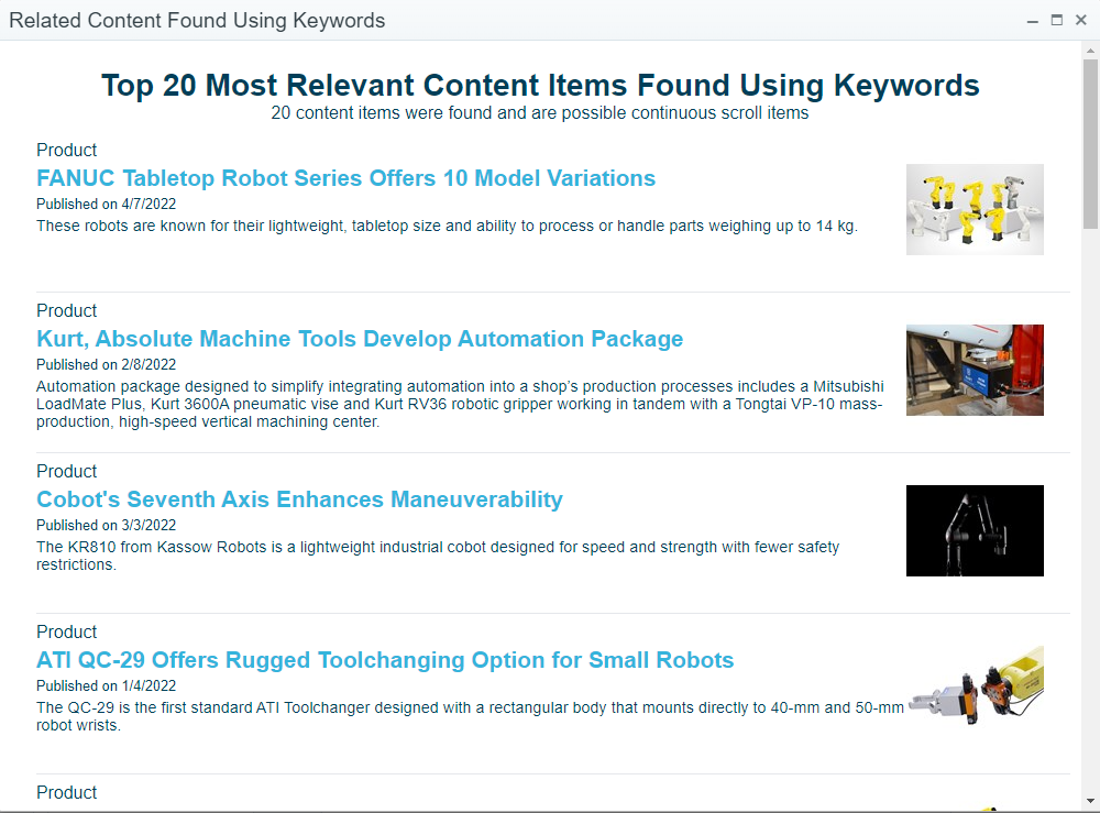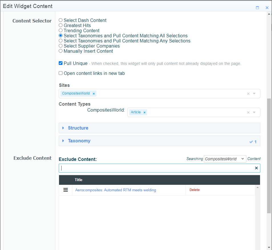 The above example is pulling all CW RTM articles, but "Aerocomposites: Automated RTM meets welding" links to the same KC so its excluded from the widget.