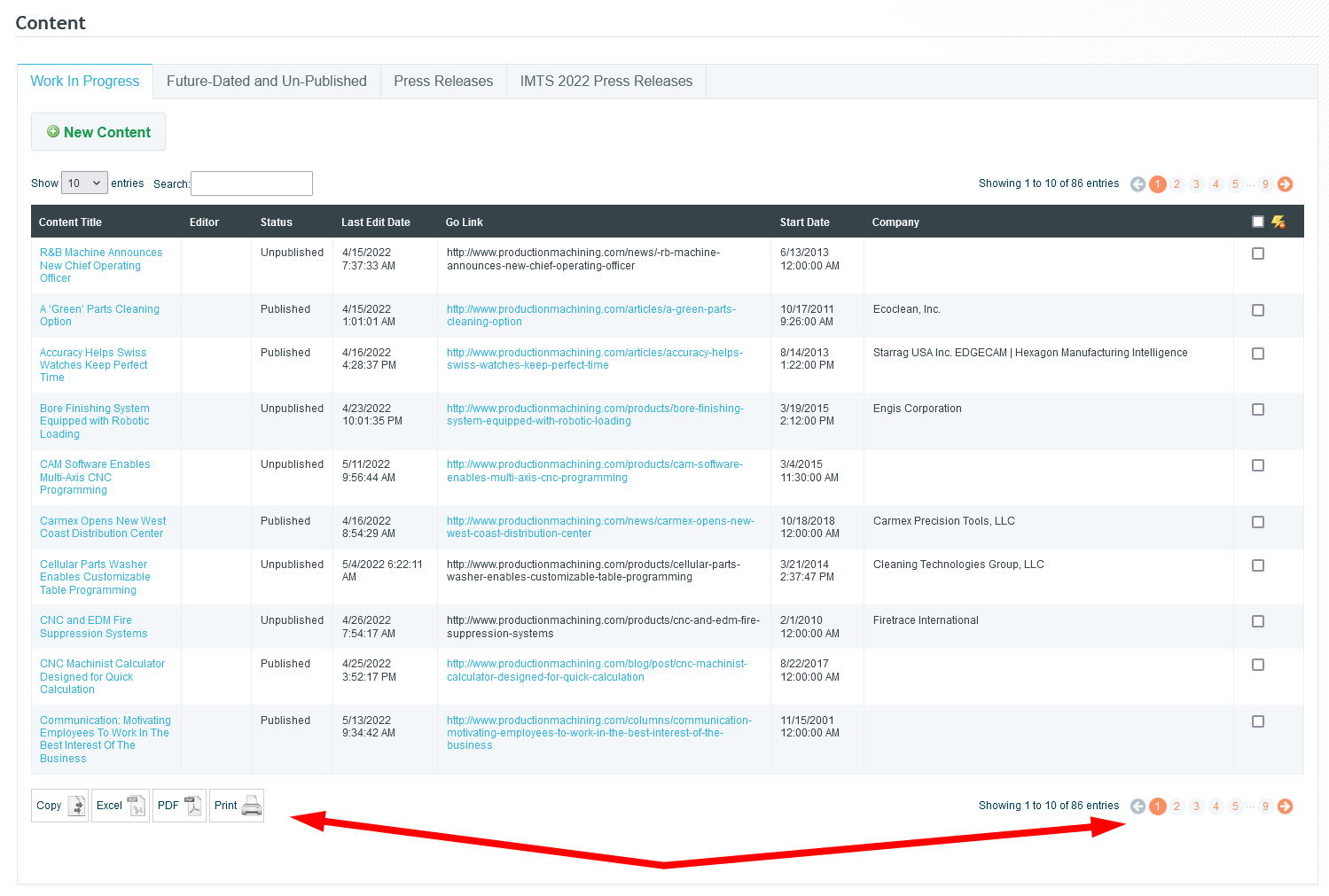 Today we updated the library we use to put together data tables within Dash. These tables are those you find on the Content Work In Progress page and the like. Prior to today, we used a very outdated version of this library that was still attempting to utilize flash. Because of this the copy, excel, and pdf buttons didn't work and haven't since flash was removed by browsers a few years ago.