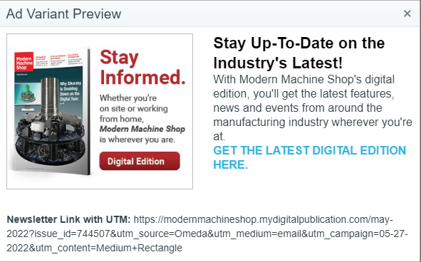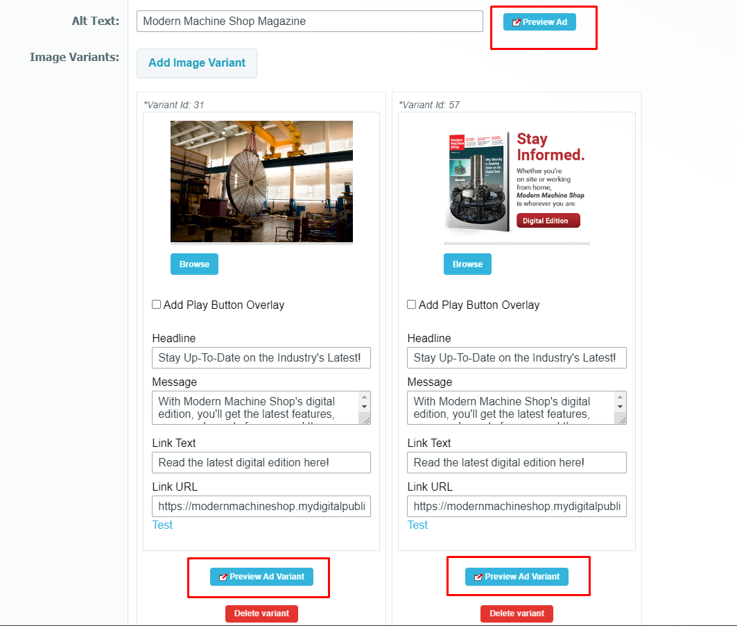 A new button has been added to the AdEdit page that will allow the Ad to be previewed. This should give a preview for how to the Ad should look within newsletters or the websites. Clicking on the ads still work as links but don't include UTM Parameters (if they exist). The link included UTM will be given as text under the Ad.