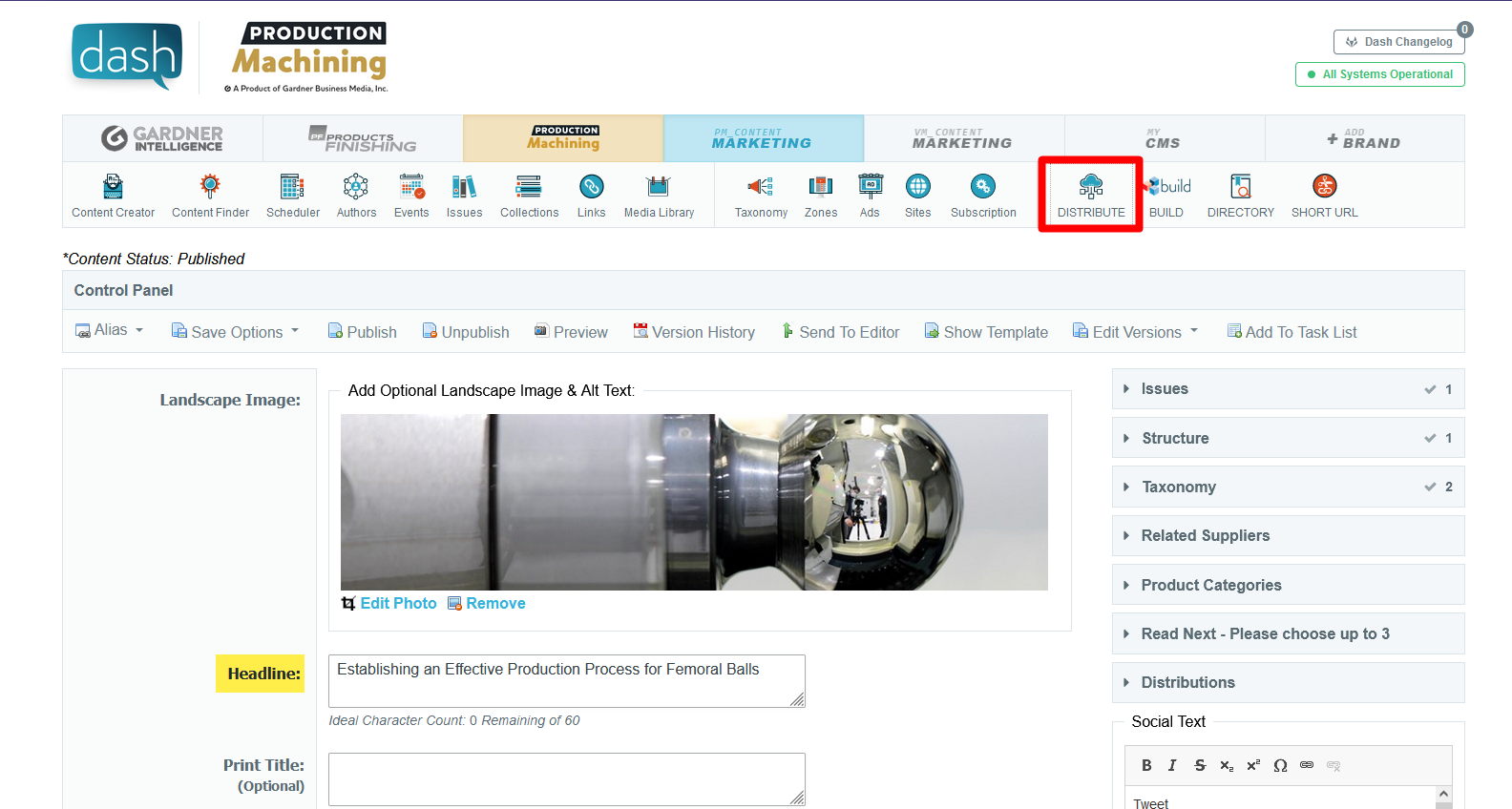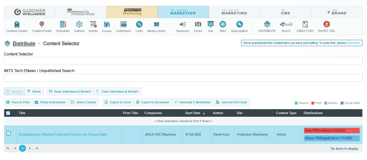 When you travel to Distribute from the Editorial App, Distribute will now load up with the content item you were editing in the Editorial App preselected within the Content Selector of Distribute. From here you can either add more items to your selections or go straight into one of the inner functionalities of Distribute.