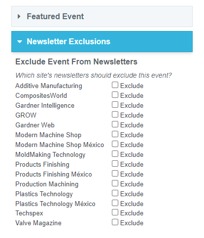 The Events and Webinar Edit Pages now have an additional card for excluding the event from Newsletters. Simply check the boxes for the site's newsletters that should not display the event.