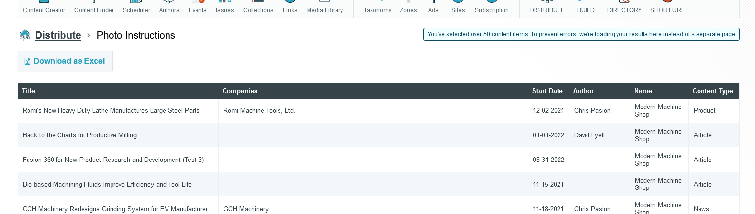 If you should select under 50 content items, these actions will behave as usual by opening the results on a new page where they can be re-ordered and exported. However, if you select over 50 content items, these actions will now be loaded on the same page to bypass the URL character length limitation. You'll still be able to re-order and export the items. When this occurs a note will be added to the page to signal this was intentional and not without reason.