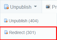 When unpublishing a content item, you can now choose to unpublish the article as a 301 redirect. Unpublish now is a dropdown where you can choose to either 404 the page or 301 redirect.