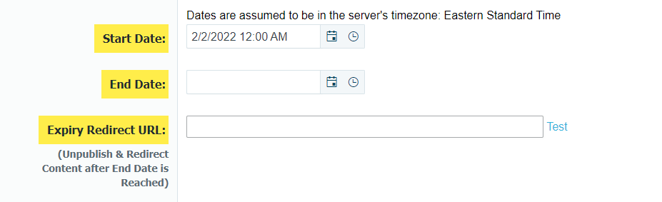 This will only come into effect once the content expires. When this happens, the content will automatically Unpublish itself and a 301 redirect will be created to the given Expiry Redirect Url. If this field does not exist, then the content will still unpublish but 404.