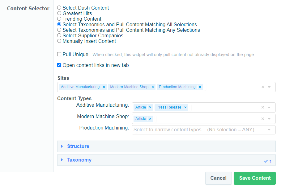 When Selecting Content via Taxonomy within a Build Widget, you are now able to select multiple sites and contentTypes. ContentTypes will be displayed when the given site is added to the sites list. It is assumed that no selections is the same as having everything selected, and selections will narrow the results.